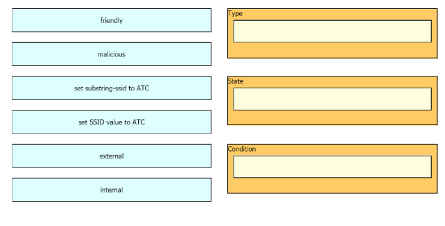 DRAG DROP The network management team in a large shopping center has detected numerous rogue APs from local coffee shops that are broadcasting SSIDs. All of these SSIDs have names starting with ATC (for example, ATC302, ATC011, and ATC566). A wireless network engineer must appropriately classify these SSIDs using the Rogue Rules feature. Drag and drop the options from the left onto the categories in which they must be used on the right. Not all options are used.