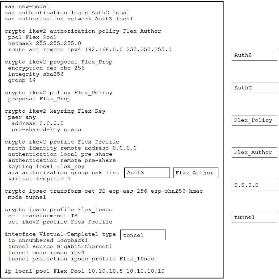 Drag and drop the code snippets from the right onto the blanks in the configuration to implement