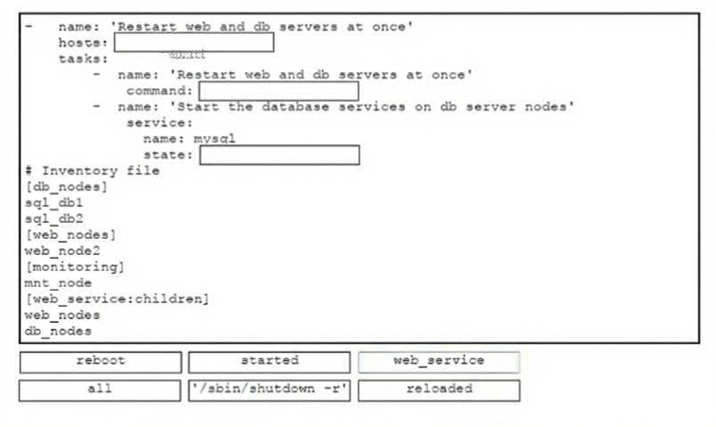 DRAG DROP Refer to the Exhibit. Drag and drop the code snippets from the bottom onto the boxes in the code in the Ansible playbook to restart multiple services in the correct sequence Not all options are used