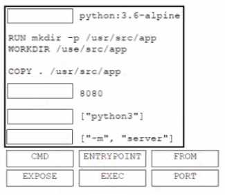 DRAG DROP A developer must containerize a Python application to integrate into a prebuilt CD environment by creating a Docker image. It will be hosted as a web application to enable end users from accessing it remotely. Drag and drop the code from the bottom onto the box where the code is missing in the Docker file Not all options are used. CISCO 350-901 question