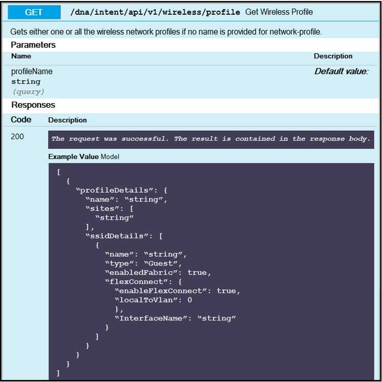 I think this is same as a common exam questions on practice-official guide helps for these. Mapping is profileName, profileDetails, ssidDetails, 0, flexConnect, enableFlexConnect. Follows the structure shown in DNA Center API docs.