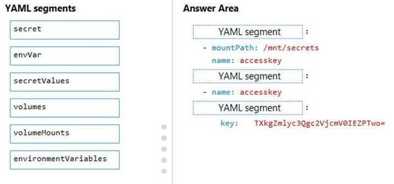 DRAG DROP You need to add YAML markup at line CS17 to ensure that the ContentUploadService can access Azure Storage access keys. How should you complete the YAML markup? To answer, drag the appropriate YAML segments to the correct locations. Each YAML segment may be used once, more than once, or not at all. You may need to drag the split bar between panes or scroll to view content. NOTE: Each correct selection is worth one point.