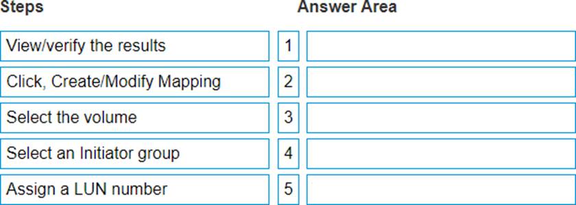 DRAG DROP When using the XtremlO WebUI, what is the correct sequence of steps to map a volume to a host?