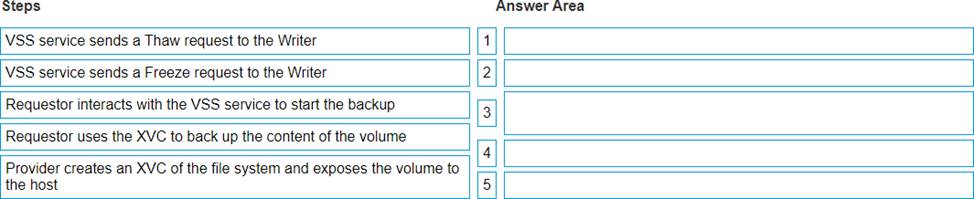 DRAG DROP When using the Microsoft VSS Framework with an XtremlO cluster to manage snapshot backups, what is the correct sequence of steps to create a Windows volume backup?