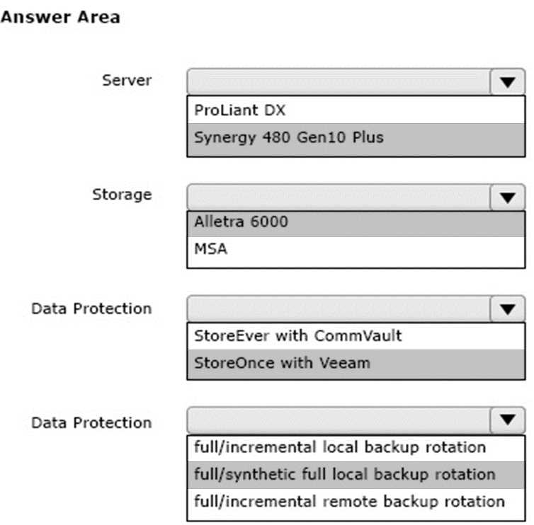 HOTSPOT Your customer has asked you to design a new platform to support their existing VMware cluster. The current environment runs their business applications along with several customer facing applications that are critical to the business. The current platform is two aged C7000 blade chassis with 16 blades in total connected via Fibre Channel to an HPE 3PAR storage array with 230TB of usable capacity. They are using Micro Focus Data Protector and tape for backup. They are looking to upgrade the environment and improve their recovery times while reducing the management overhead. Which server, storage, and data protection strategy meet all the customer requirements? HP HPE0 V27 question