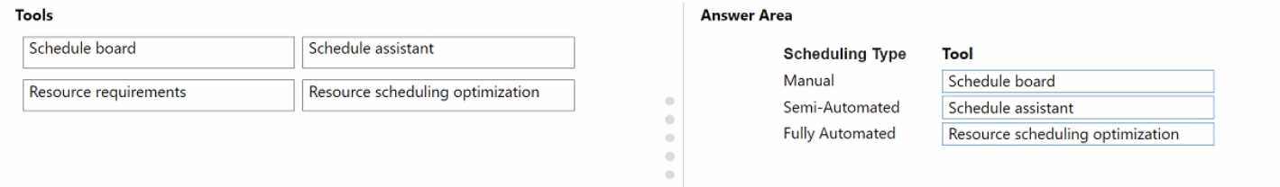 To answer, drag the appropriate tool from the column on the left to its scheduling type on the right.