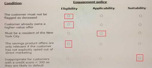 DRAG DROP You are a strategy designer on a next-best-action project and are responsible for designing and implementing decision strategies. Select each component on the left and drag it to the correct requirement on the right.