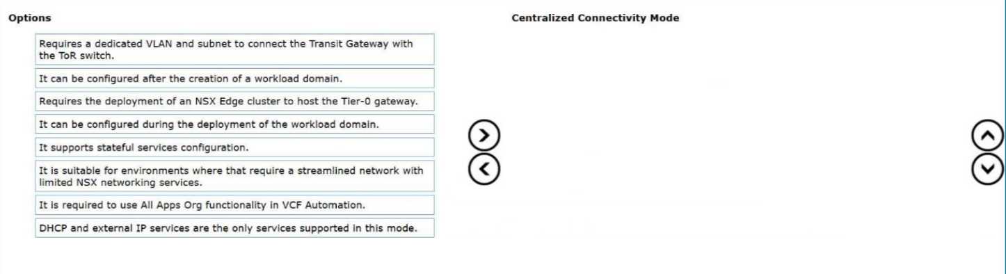 DRAG DROP An administrator was asked to explain the characteristic and requirements of Centralized Connectivity Mode which is planned to be configured in one of the workload domains in VMware Cloud Foundation (VCF) environment. Drag and drop four options from the Options list on the left and place them into the Centralized Connectivity Mode on the right in any order. (Choose four.) VmWare 3V0 25 question