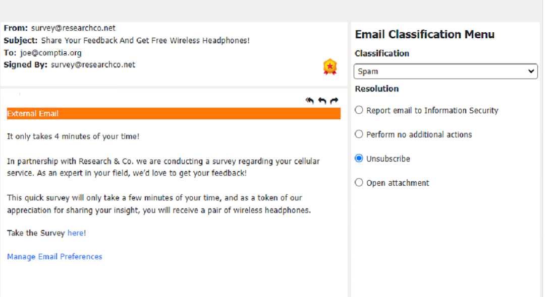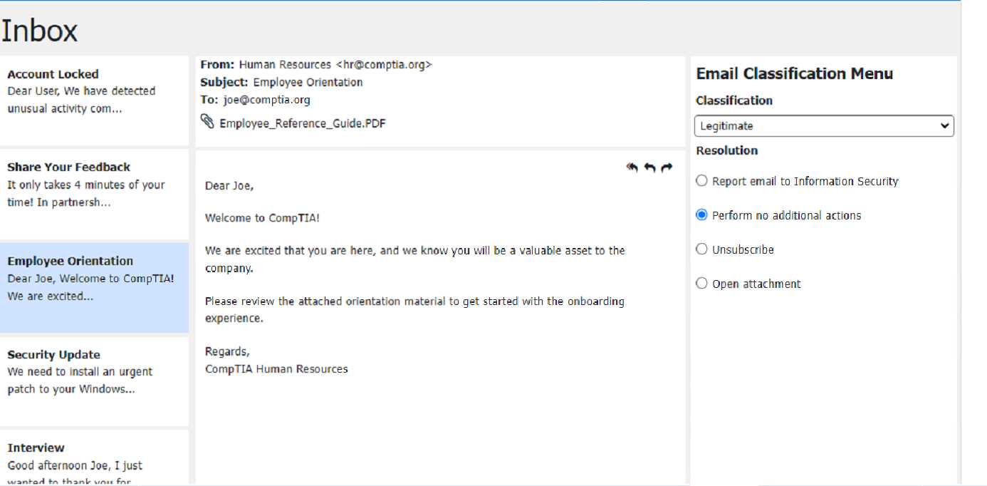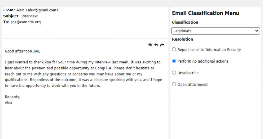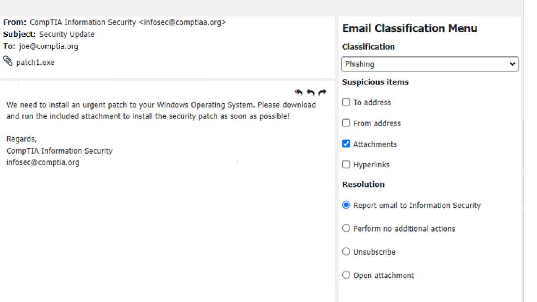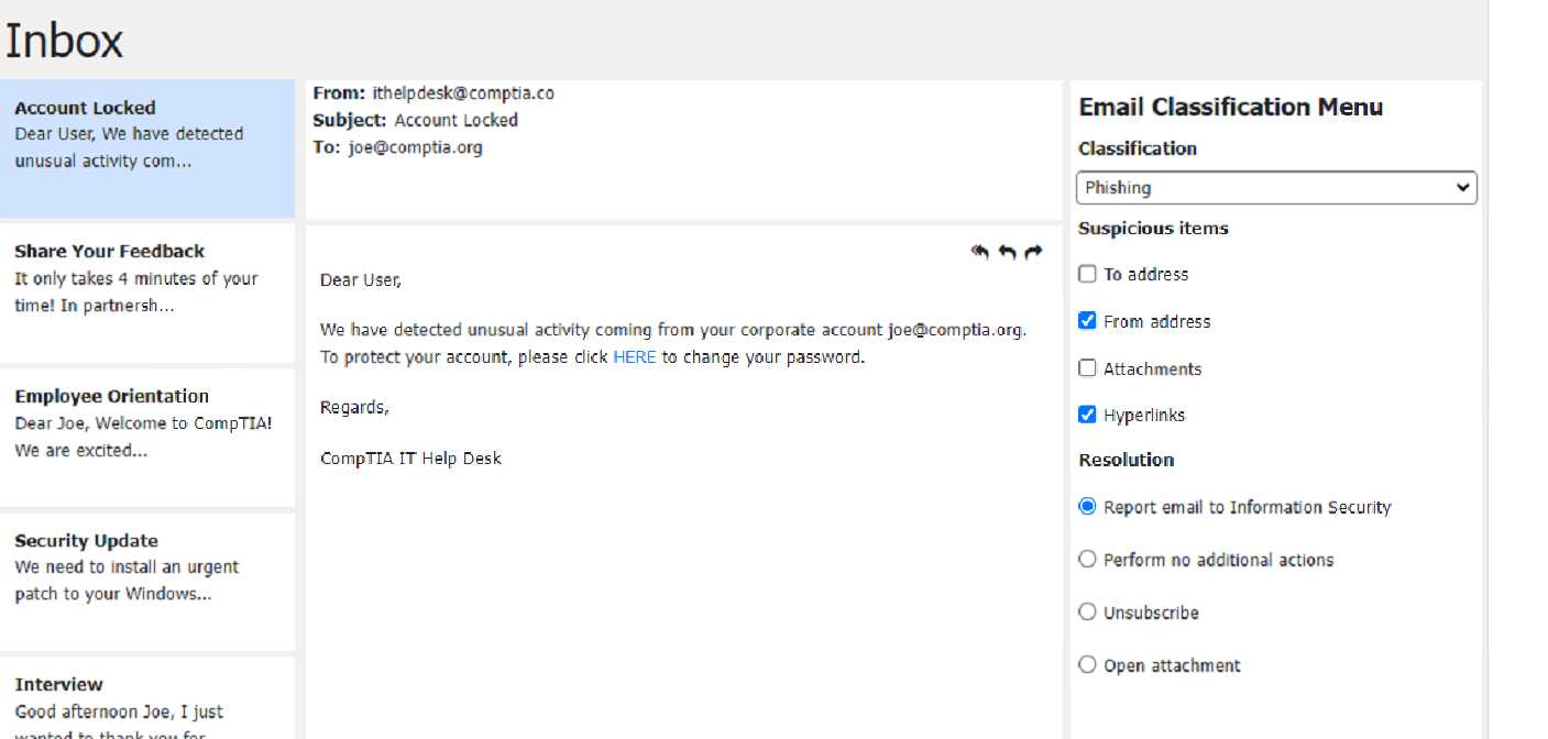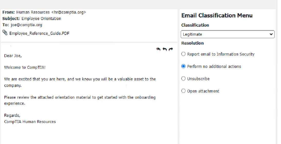 SIMULATION As a corporate technician, you are asked to evaluate several suspect email messages on a client's computer. Corporate policy requires he following: . All phishing attempts must be reported. . Future spam emails to users must be prevented. INSTRUCTIONS Review each email and perform the following within the email: . Classify the emails . Identify suspicious items, if applicable, in each email . Select the appropriate resolution CompTIA 220-1102 Dumps question