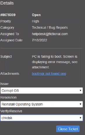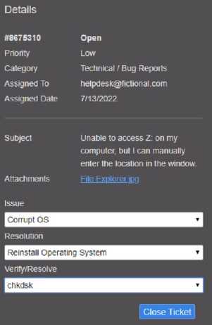 HOTSPOT Welcome to your first day as a Fictional Company. LLC helpdesk employee. Please work the tickets in your helpdesk ticket queue. Click on individual tickers to see the ticket details. View attachments to determine the problem. Select the appropriate issue from the 'issue' drop-down menu. Then, select the MOST efficient resolution from the 'Resolution' drop-down menu. Finally, select the proper command or verification to remediate or confirm your fix of the issue from the Verify Resolve drop-down menu. CompTIA 220-1102 Dumps question CompTIA 220-1102 Dumps question